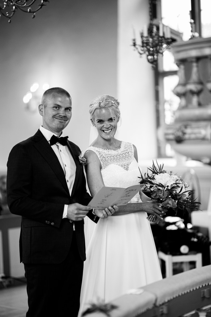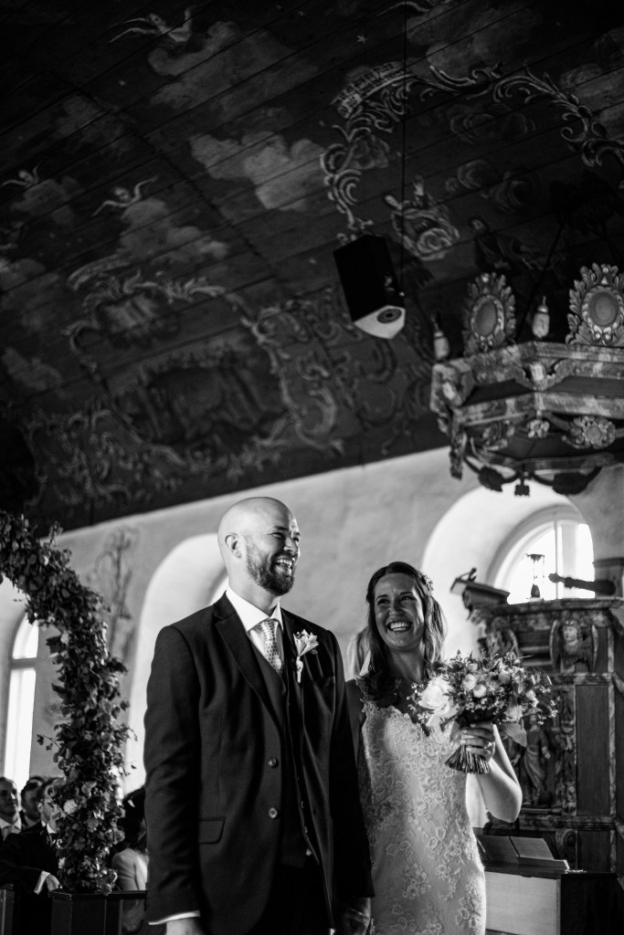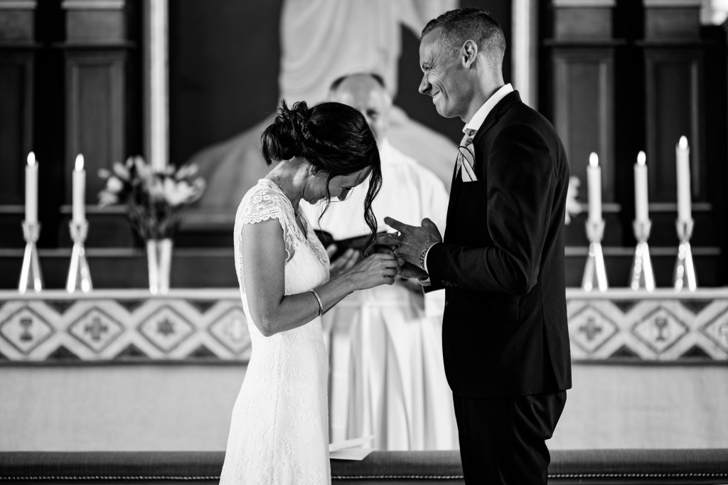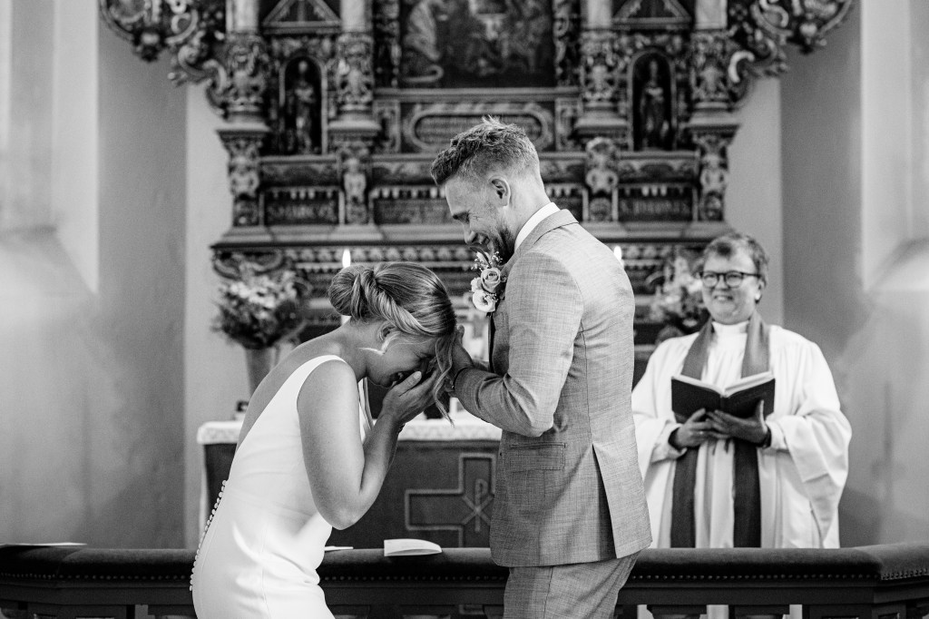 Det är nu ni blir man och fru. Den viktigaste – och för många mest nervösa biten. Att gå in i kyrkan – möta familj och vänners blickar – och samtidigt håll ett lugn och få på ringarna, vilket brukar vara en utmaning. Jag håller mig i bakgrunden och pratar alltid med prästen innan så att han/hon vet vem jag är och kan godkänna mina positioner. Jag är diskret och smidig, samtidigt som jag är på tårna för att inte missa tårar, skratt och växling av ringar.